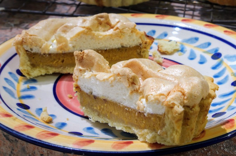 I added a meringue top, inspired by Tom Gilliford from 2016’s The Great British Bake-off. It’s much more traditional to serve pumpkin pie plain with a bit of whipped cream, but I love meringue more than I love whipped cream, and was curious to see if it would work. I’m not sure if putting meringue on top of pumpkin pie is considered heresy in America or not, but I do remember a friend’s mother making a pumpkin/cheesecake hybrid pie for Thanksgiving, and that seemed to be considered okay (and was delicious). Some countries have strict rules about what is considered correct – see Italians on pizza and Spaniards on paella – but I’m not sure the same applies to American cooking, which is often very creative.