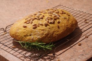 Pumpkin bread is dense and chewy, and in the loafs I made, carried a strong flavour of rosemary and paprika. The pumpkin itself adds a little sweetness, and makes the bread turn a lovely beige. It goes very well with cheese or soup.
