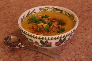 The recipe called for chunks of uncooked pumpkin, rather than puree, but once the pumpkin is carved and added to the simmering water, you just have to leave it to dissolve. I added a stick of cinnamon, and garnished with paprika and coriander leaves. I also added some toasted pumpkin seeds, which I’d saved from my harvested pumpkins, boiled in salted water, and roasted with olive oil.
