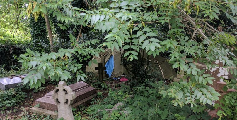 Now there was only one row of graves between her and the tent: a dozen rectangles and crosses, blanketed in ivy. The tent squatted indifferently. The fabric was worn and ripped in a few places, as if it belonged to a tramp. She ought to tell someone about it.